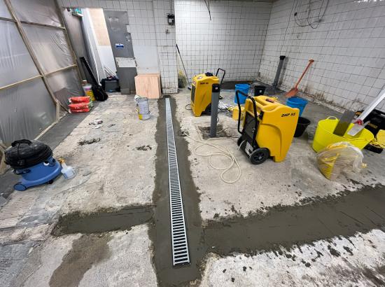 To achieve a level and durable foundation, a large section of the existing concrete floor was cut out and replaced. New floor drains were installed to improve water and waste management, and once the concrete had fully cured, a high-performance resin floor with a gritty, slip-resistant finish was applied. This provided a hygienic, hard-wearing, and safe surface suitable for the demands of a busy commercial ware-washing environment.