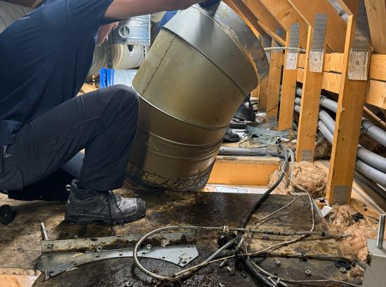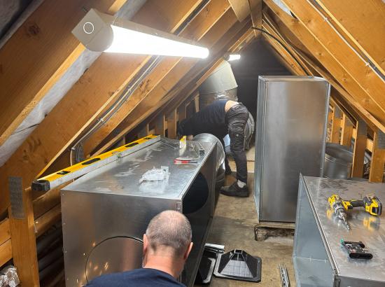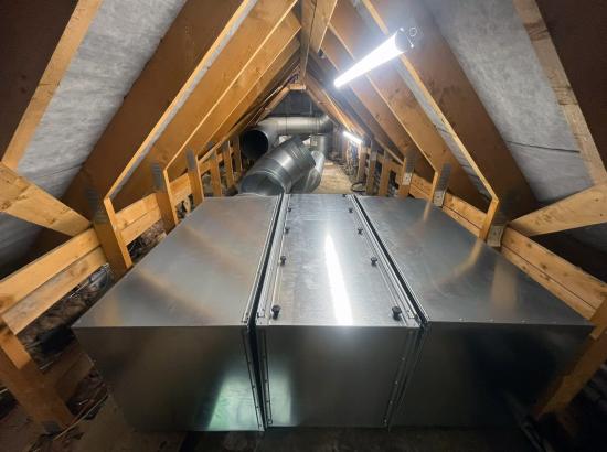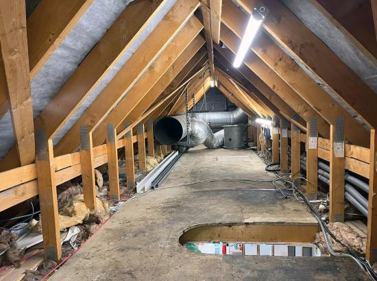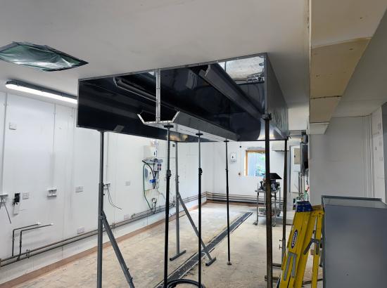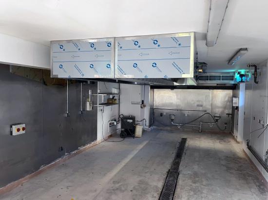 Our team then installed new PVC White Rock wall cladding, providing a clean and hygienic surface throughout. Following this, we fitted a central island canopy complete with extract ductwork. The system incorporated a full filtration setup with pleated panel filters, helping to minimise grease and dirt build-up on the fan and significantly extending its service life.