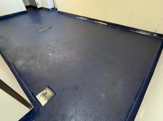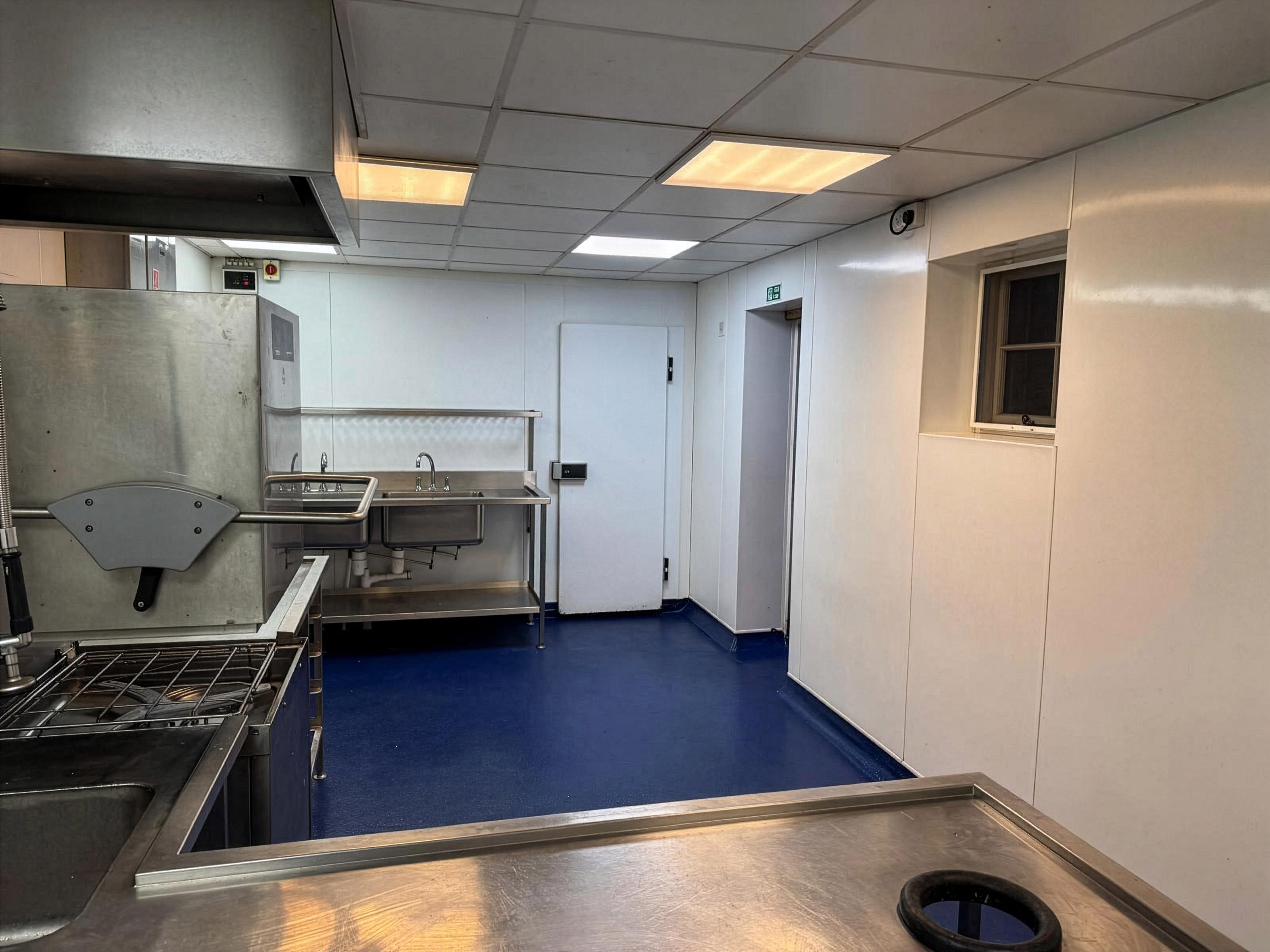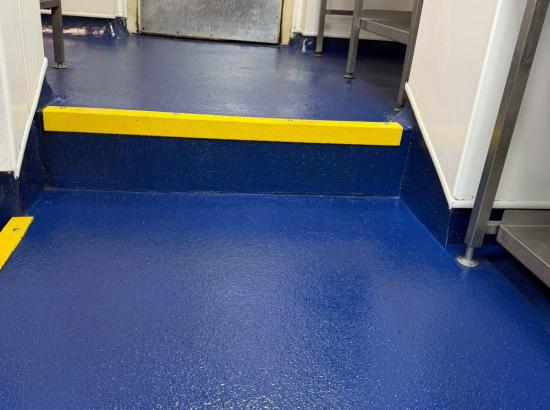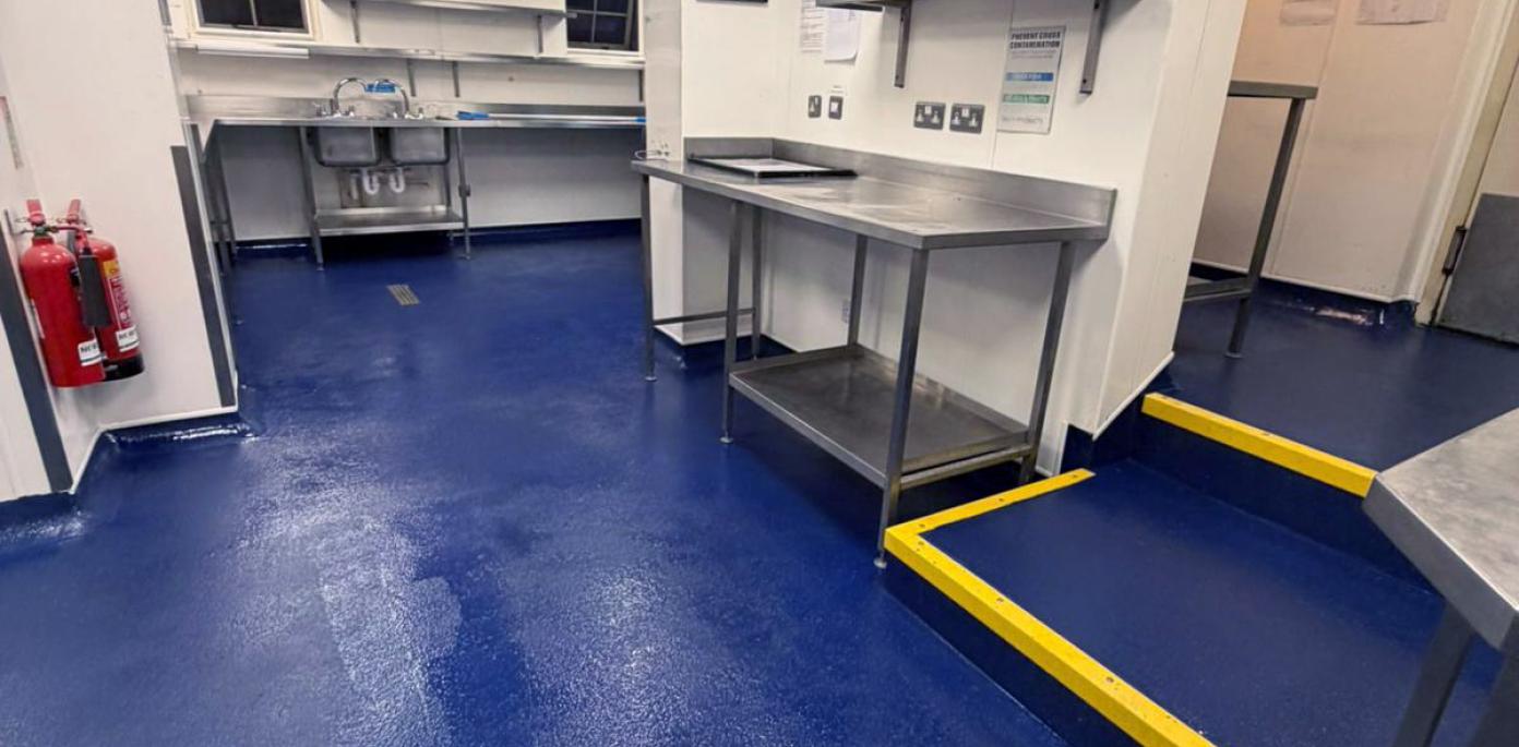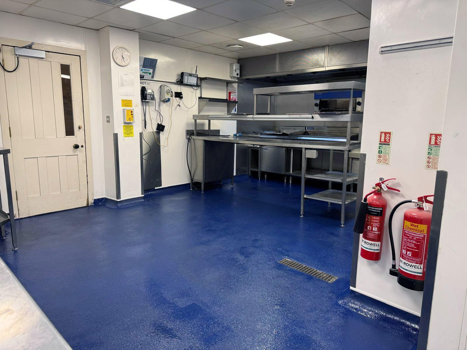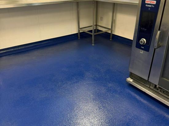 Once cured, multiple coats of blue resin incorporating coarse aggregate were applied to create a durable, non-slip surface with a consistent finish. Resin flooring is ideally suited to commercial kitchen environments due to its strength, resistance to chemicals, heat, and moisture, and its seamless nature, which supports high hygiene standards and ease of maintenance.