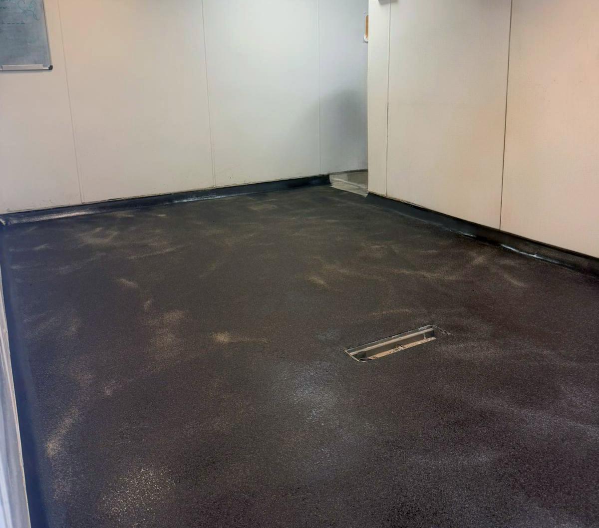 A high-performance resin flooring system was then installed across the kitchen and ware-washing areas. To achieve a perfectly level surface, a black self-levelling resin was applied throughout. While still semi-dry, a layer of grit was broadcast into the resin to enhance slip resistance, helping to improve safety in wet and high-traffic working conditions.